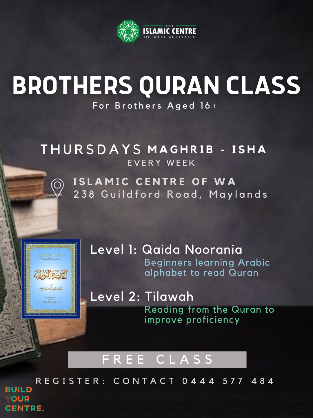 Level 1 - Qaida Noraniya Beginner Quran classes for brothers starting from the Arabic alphabet. The Qaida Nouraniya system will be used which is very effective in teaching non-Arab speakers how to read the Quran This system is also beneficial for readers of the Quran who would like to improve their fluency and pronunciation